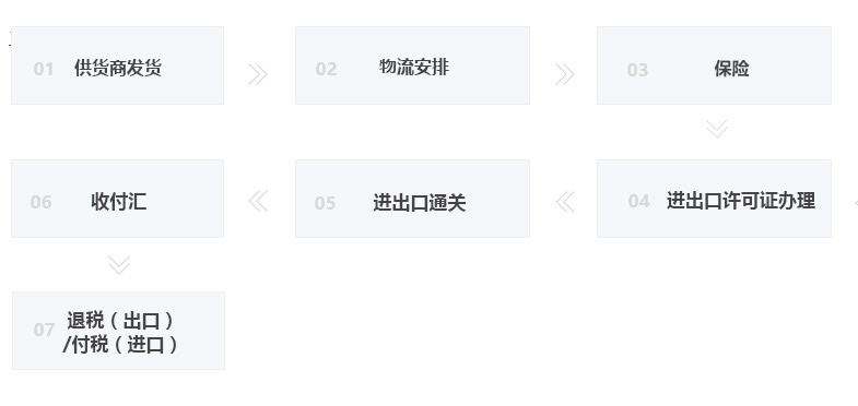供货商发货 → 物流安排 → 保险 → 进口许可证办理 → 进口通关 → 进口付汇 → 付税(进口)